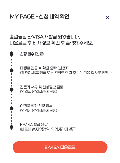 발급 완료 후 "MY PAGE"에서 E-비자를 비자를 다운로드 받아 출력후 이용하세요.